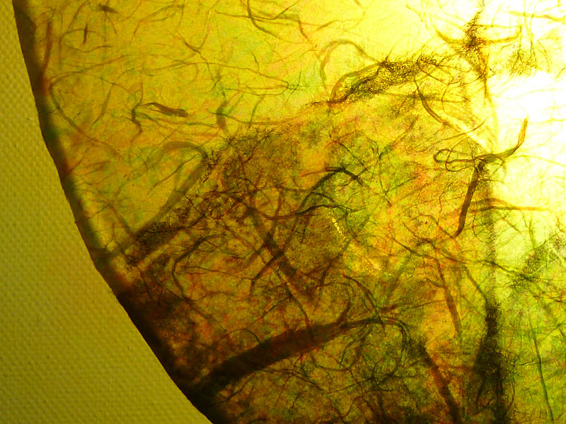 Auf der transparenten Blende befindet sich eine Collage aus Seidenpapier, die die Strukturen des Schildkroetenpanzers wieder aufgreift. Hinter der Blende liegt ein LED-Einbaustrahler, der bei Bedarf kinderleicht ausgewechselt werden kann.