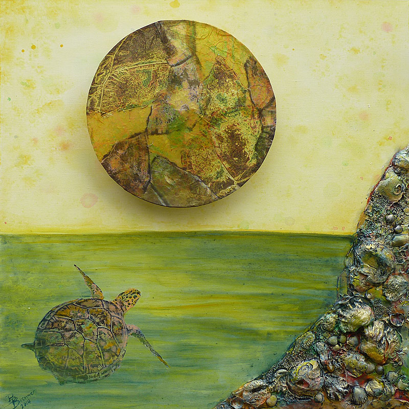 Das Bild besticht durch Glanzeffekte auf dem Ruecken der Schildkroete, den leichten Schimmer auf dem Wasser sowie das bunte und intensive Relief des Felsens.